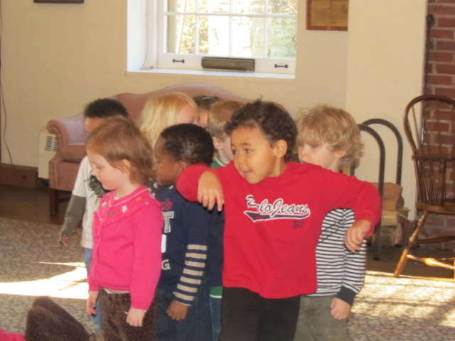Then we headed off for Movement with Missy. We did some warm-up stretching. Then we played a game where we had to run to a color spot when the music stopped. We also got to play with the balls. Friends worked on throwing and catching together. Missy brought out a giant rubber band that we all held onto together and moved it, and ourselves in unison.